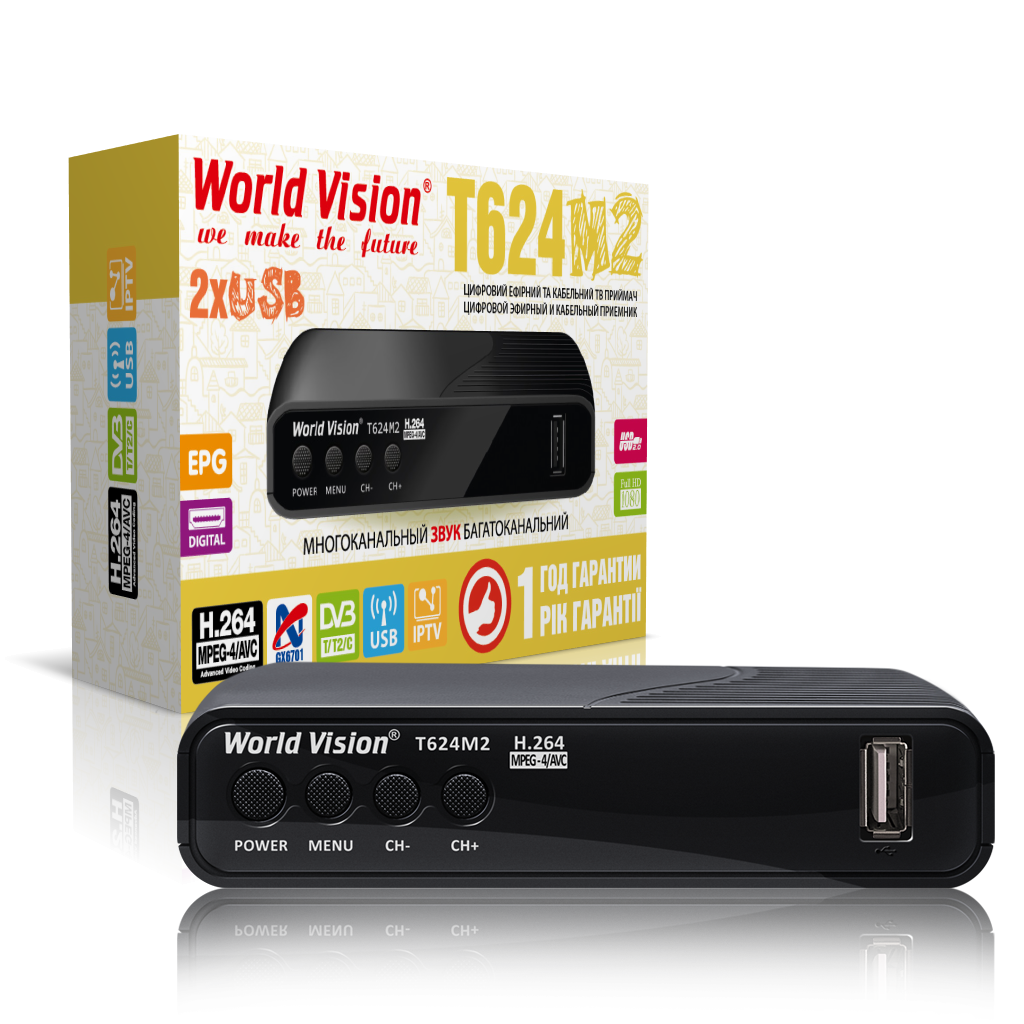 Новий цифровий ефірний ресивер World Vision T624M2 оснащен високопродуктивним процесором GUOXIN GX6701 і підтримує прийом цифрового телебачення стандартів ефірного DVB-T/T2 і кабельного DVB-C. Ця модель є оновленням ресивера T62M2, але з новим апаратним забезпеченням і графічною оболонкою, яка не поступається попередній за зручністю використання, а всі зміни в програмному забезпеченні були ретельно продумані і змінені тільки для підвищення стабільності роботи нового програмного забезпечення. Ресивер World Vision T624M2 оснащен перевіреним тюнером Max Linear MXL608 з відмінною чутливістю для прийому сигналів DVB-T/T2 і DVB-C, що забезпечує стабільну передачу і високу якість цифрового зображення на екрані телевізора. Як і всі нові цифрові ресивери World Vision, його можна підключити до бездротової мережі за допомогою зовнішнього USB Wi-Fi адаптера. Підключившись до Інтернету, ресивер пропонує оновлення програмного забезпечення через Інтернет, інформацію про погоду на тиждень у додатку "Погода", IPTV-плеєр для перегляду інтернет-трансляцій телеканалів, Megogo з його великою бібліотекою фільмів, серіалів і мультфільмів. Доступні додаткові програмні функції, такі як онлайн-кінотеатр та новини в форматі RSS. T624M2 від World Vision підтримує всі види функцій PVR, включаючи стандартний миттєвий запис телепрограм, запис за таймером, встановленим вручну або через програму телепередач, а також відкладений моніторинг зі зміною часу, коли підключений USB-накопичувач пам'яті. У ньому також реалізовані всі функції попередніх популярних моделей серії T62, такі як синхронізація часу через Інтернет, перехід в режим очікування в разі аварійного відключення електроенергії. Відмінність World Vision T624M2 від інших ресиверів з процесором GUOXIN GX6701 полягає у відсутності світлодіодного дисплея і наявності кнопок управління на передній панелі. Програмне забезпечення адаптовано для всіх приставок World Vision, побудованих на платформі GX6701.